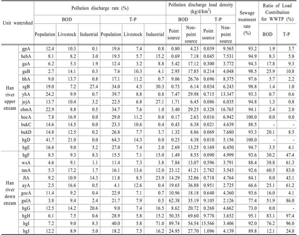 또한 발생부하량 대비 배출부하량비를 분석한 오염원별 배출율, 단위유역 내 하수처리율 및 단위유역 내 점배출부하량 중 기초시설에 따른 배출부하량의 기여도를