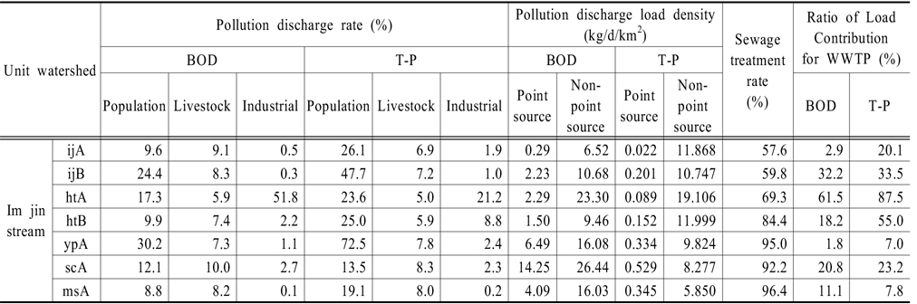 단위유역 내 전체 배출량에 미치는 기여도는 BOD 70.4%, T-P 93.1%로 나타났다.