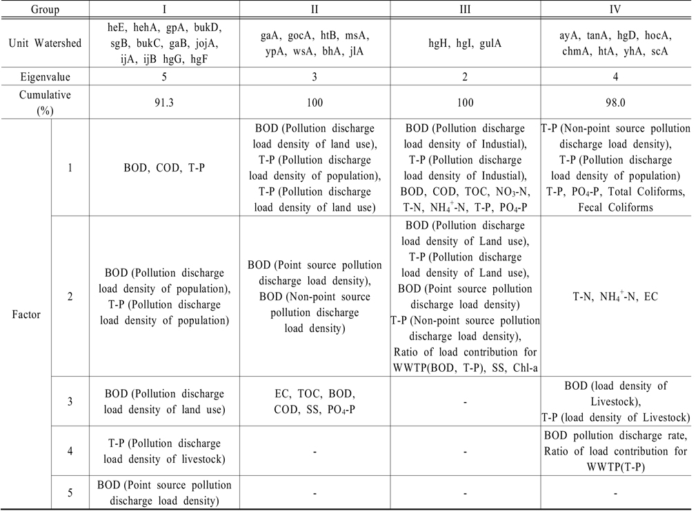 각 군집의 결과해석을 위하여 분류된 그룹별 요인분석을 수행하였다. 요인추출 결과 4개 그룹에 대한 수질항목 및 부하량 변동에 주요인으로 Table 7과 같이 조사되었다.
