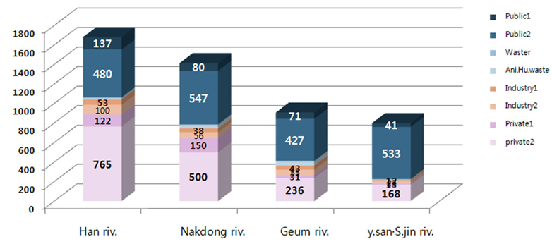 개별배출시설 중 할당대상으로 고려되는 시설은 직접 방류 시설로서, 각 수계별 환경기초시설, 산업체, 오수처리시설에서 직접방류 시설을 Table 2 및 Fig. 1과 같이 정리하였다. 각 수계별 개별배출시설 중 직접방류 시설현황은 4대강 모두 공공하수1, 공공하수2를 제외하면 “오수2”가 가장 많은 비율을 차지하는