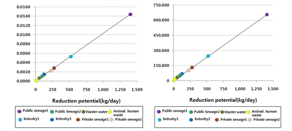 삭감잠재량 대비 수질 개선효과는 Table 8과 같이 산업1 0.005 mg/L, 오수1 0.003 mg/L, 오수2 0.002 mg/L, 산업2 0.001 mg/L 으로 공공하수1이 0.014