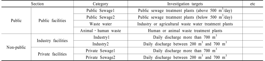 오염총량관리시행계획 이행평가기준(MOE, 2014b)(이하 “이행평가기준”) <별표 1>(수질 유량의 조사대상 및 주기) 상의 시설을 기준하여 Table 1과 같이 공공과 민간으로 개별배출시설을 구분하였다. 공공은 공공하수1, 공공하수2, 폐수종말, 가축분뇨로 구분하고 민간은 산업1, 산업2, 오수1,