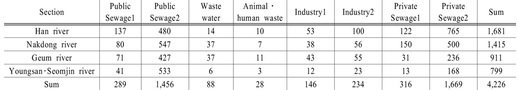 본 연구에서 BOD저감대상량은 현재배출량 기준으로 시설별 배출유량에 방류수질을 곱하여 산정하고, T-P는 ‘12년 이후 강화된 수질기준으로 시설용량에