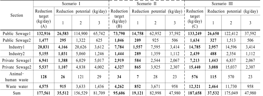 시나리오 I, II, III의 BOD 저감 대상량은 Table 3과 같이 각각 177,561 kg/일, 96,606 kg/일, 187,658 kg/일로 나타났다. BOD의 경우 1단계 시행성과 등으로 법적방류수질보다