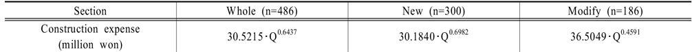 시설의 평균 처리용량이 더 컸으며, 처리용량 당 평균건설비용도 2배 정도 더 높으며 처리장 용량과 건설비와의 관계를 추정하면 Table 5와 같다(MOE, 2008b).