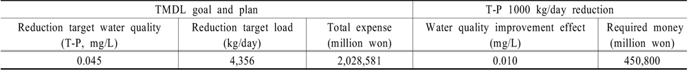 삭감량과 사업비용을 이용해 개별배출시설의 삭감에 따른 수질개선효과를 Table 6과 같이 추정하였다. 낙동강수계의 경우 T-P 1,000 kg/일 삭감시 물금의 수질개선효과는 0.01 mg/L, 소요비용은 약 450,800백만원으로