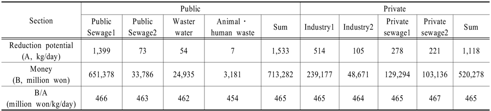 수질개선효과가 있을 것으로 추정된다. 물금지역 T-P 수질개선에 따른 삭감비용을 민간개별배출시설에 적용시 Table 7과 같이 520,277백만원 (1,000 kg/일 삭감시 450,800백만원 삭감비용적용)이 소요될 것으로 추정된다. 그리고 법적배출량 기준에서 일괄