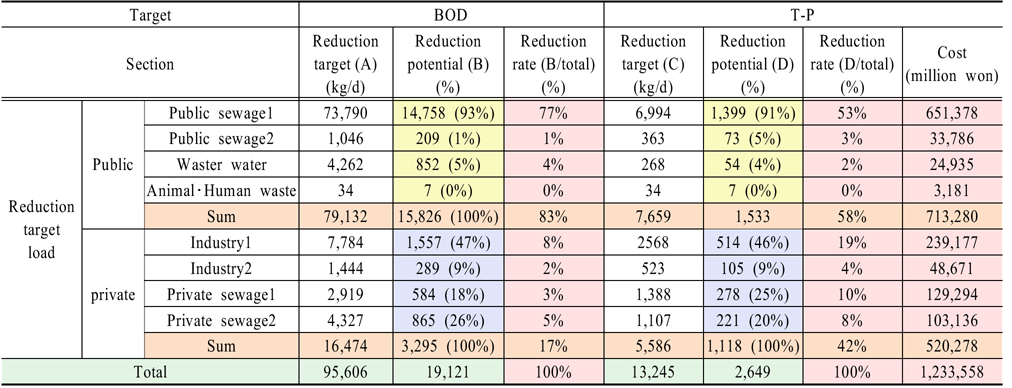 The results of reduction target load for BOD and T-P reduction potential analysis