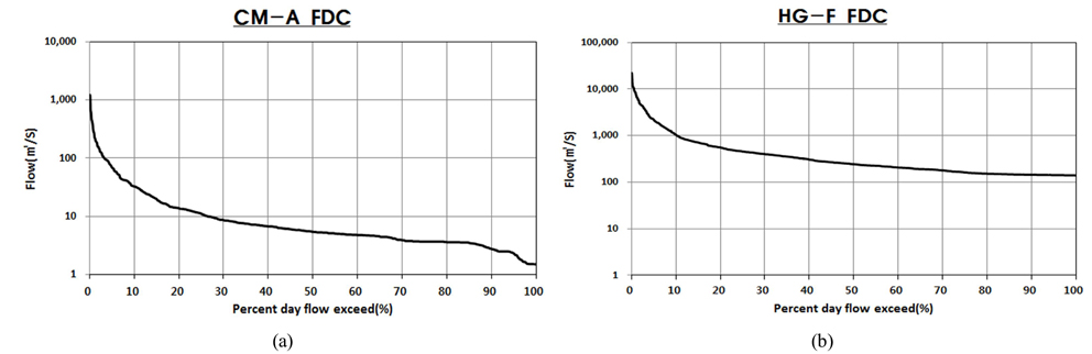 도출된 일유량 자료를 최대유량에서 최소유량 순으로 배열하여 특정유량을 초과하는 일수를 백분율로 계산하여 도시화한 유량지속곡선을 Fig. 2와 같이 작성하였다.