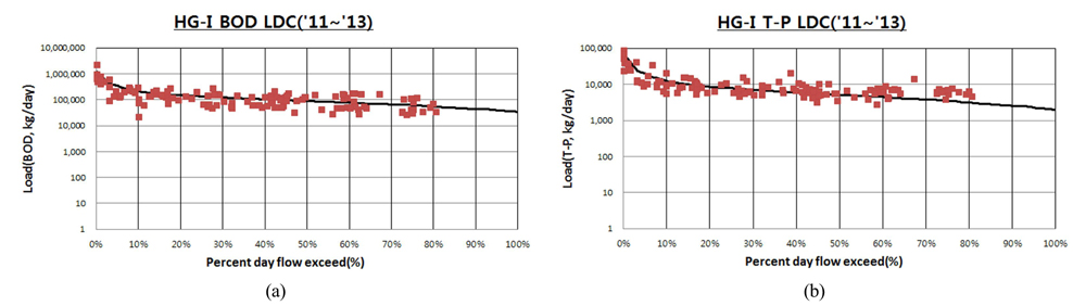 위한 실측자료는 2011~2014년 8일 간격 유량 및 수질측정자료(NIER, 2014)를 이용하였다. 부하지속곡선에 실측부하량을 도시하여 초과율이 50% 이하이면 목표수질을 달성하는 것으로 평가하였다.