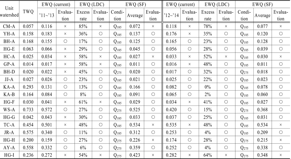 현행 평가방법과 LDC평가방법, 기준유량조건 평가방법의 결과를 비교하였다. 각 방법별로 다르게 나타났으나 LDC 평가방법에 의한 방법이 기존방법보다