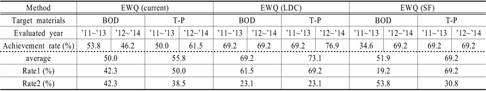 1) 현행규정에 의한 목표수질 평가방법은 달성율이 50~56%로 나타났으며, LDC에 의한 목표수질 평가방법은 달성율이 69~73%로 나타났다.
