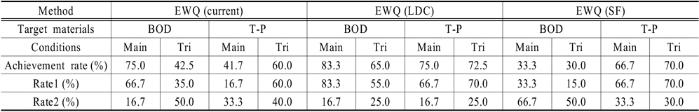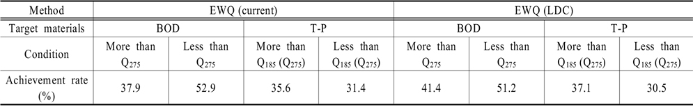 나타났다. 지류의 달성율도 평가수질 42.5%, LDC평가 65.0%, 기준유량조건 평가 30.0%로 LDC 평가에 의한 결과가 달성율이 가장 높은