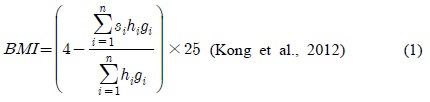 또한 Kong et al. (2012)의 저서동물지수(Bentic Macroinvertebrate Index; BMI)를 적용하여 생물학적 환경질을 평가하였다(식 (1)).