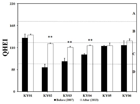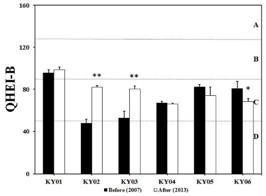 QHEI에 의한 물리적 서식지 평가결과 복원사업 후에 전체적으로 개선된 결과를 보였으며, 특히 KY02~04 지점은 고도로 유의한 수준의 차이를 보였다(Fig. 2).