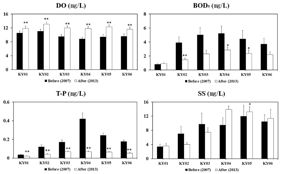 이에 반해 부유물질 농도는 하류구간(KY04~06)에서 사업 후에 오히려 증가하였다. 이는 Song (2010)의 경기도 생태하천복원 실태조사 연구에서 복원사업 후 다른 수질항목과 달리 부유물질의 농도는 개선되지 않았음을 보고한 사례와 같다. 하천의 부유물질