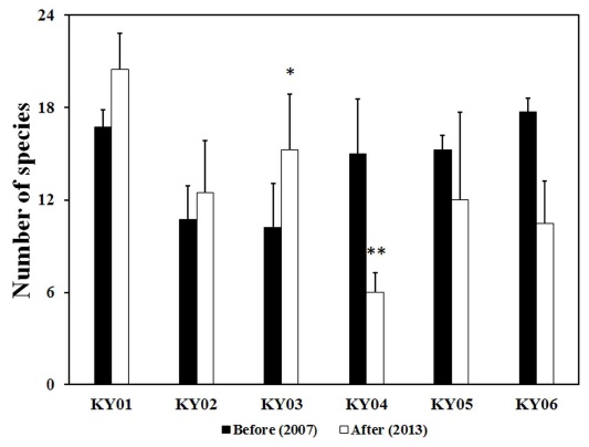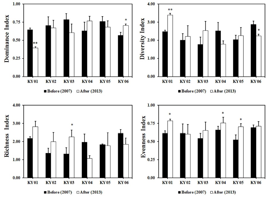 감소하였다. 이와 반면 KY04, KY06 지점은 우점도가 증가하였고, 다양도와 풍부도는 감소하였다. 전체 조사지점에서 복원사업 전에 우점종이었던