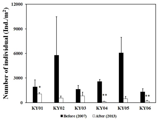 복원사업 전에 KY02, KY03 지점에서는 실지렁이(Limnodrilus gotoi)와 깔따구류(Chironomidae sp.), KY04, KY05, KY06 지점에서는 줄날도래(Hydropsyche kozhantschikovi)가 대량 출현하여 전체적으로 출현개체수가 컸다(Fig. 6).