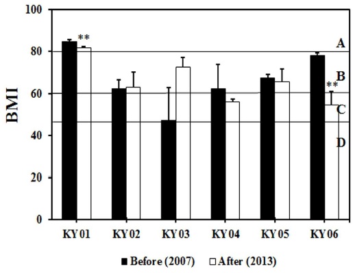 BMI: Kong et al. (2012)’s benthic macroinvertebrate index) before and after the restoration project evaluated