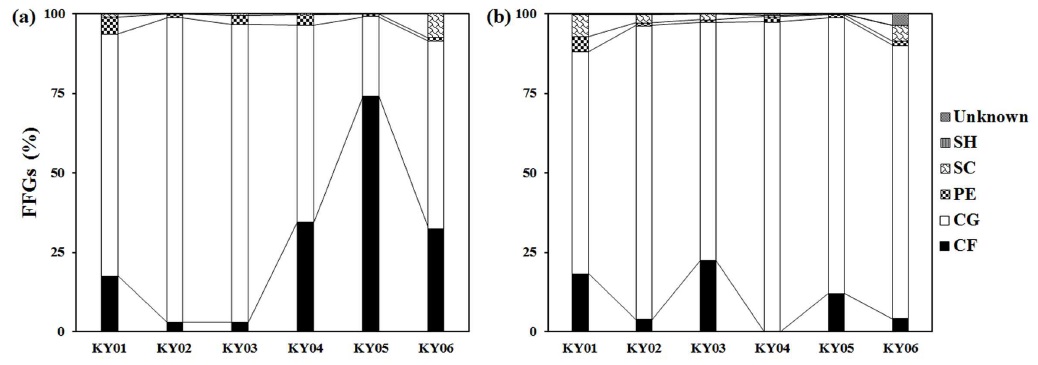 복원사업 전·후에 경안천에서는 주워먹는 무리(CG)와 걸러먹는 무리(CF)가 80~95%를 차지하였다(Fig. 9).