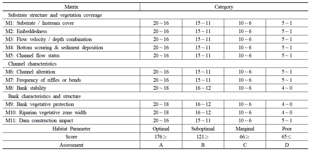 각 지점의 서식지에 대한 물리적 평가는 경안천 생태조사(GIHE, 2008)에서 적용한 QHEI (Qualitative Habitat Evaluation Index)에 따랐다(Table 1). 이 지수는 Plafkin et al. (1989)이 제시하고 Barbour et al. (1999)가 수정‧변경한 것이다. 또한 QHEI의 평가요소에서 저서성 대형무척추동물에게 직접적인 영향을 미치는 하상구조(M1~M5)와 수로 특성(M6~M8)만을
