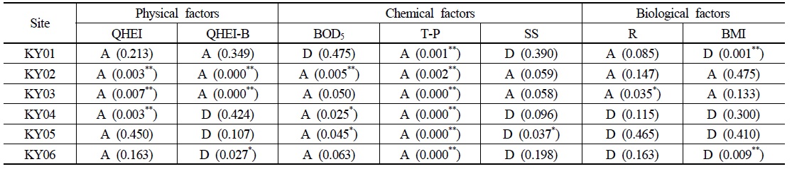 각 조사지점별 복원사업 전·후의 물리적(QHEI, QHEI-B), 화학적(BOD5, T-P, SS), 생물학적(R, BMI) 평가항목을 쌍체 t-검정한 결과는 Table 2와 같다.