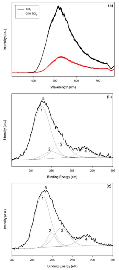 (a) Photoluminescence spectra of TiO2, GO10-TiO2 and C 1s core-level XPS spectra of (b) before the GO10-TiO2 experiment and (c) after the GO10-TiO2 experiment.
