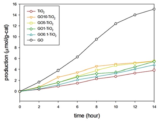 물질과 연결이 가능하다. GO에 존재하는 주요 산소작용기인 카르복실기와과 수산화기는 전자전달에 좋은 연결고리이기에 GO와 TiO2가 좋은 시너지 효과를 얻을 수 있을 것으로 예상된다. 뿐만 아니라 GO는 기체 흡착능을 향상시킬 수 있으며 CO2 흡착에 높은 성능을 가진 것으로 알려져 있다(Garcia-Gallastegui et al., 2012; Sayama et al., 2000). 기존의 연구에서는 전도율을 향상시키기 위하여 GO를 환원된 형태로 많이 적용되었으나, 환원되지 않은 GO로 홀-전자 재결합 현상을 줄일 수 있어