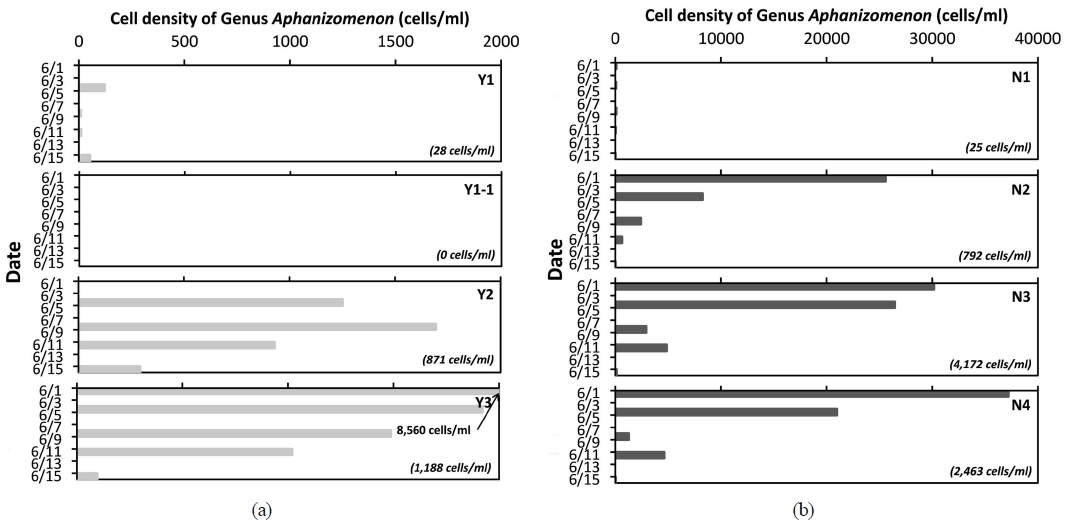Aphanizomenon 속은 일시적인 증가 이후 빠르게 감소하였는데, 조사기간 동안 최대 현존량을 보인 N4 지점에서 2015년 6월 1일 37,200 cells/ml에서