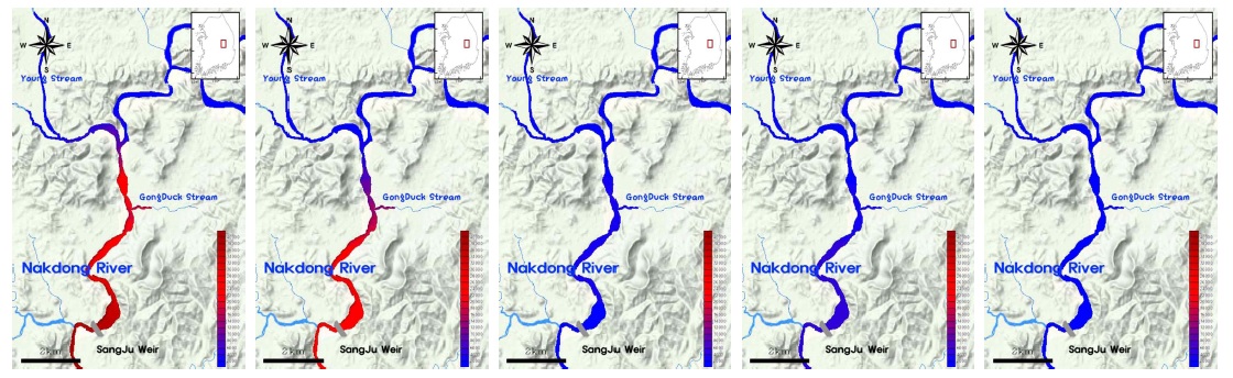 Map of spatial changes in Aphanizomenon spp. cell densities (cells/ml) for 15 days in the upper region of the Nakdong River.