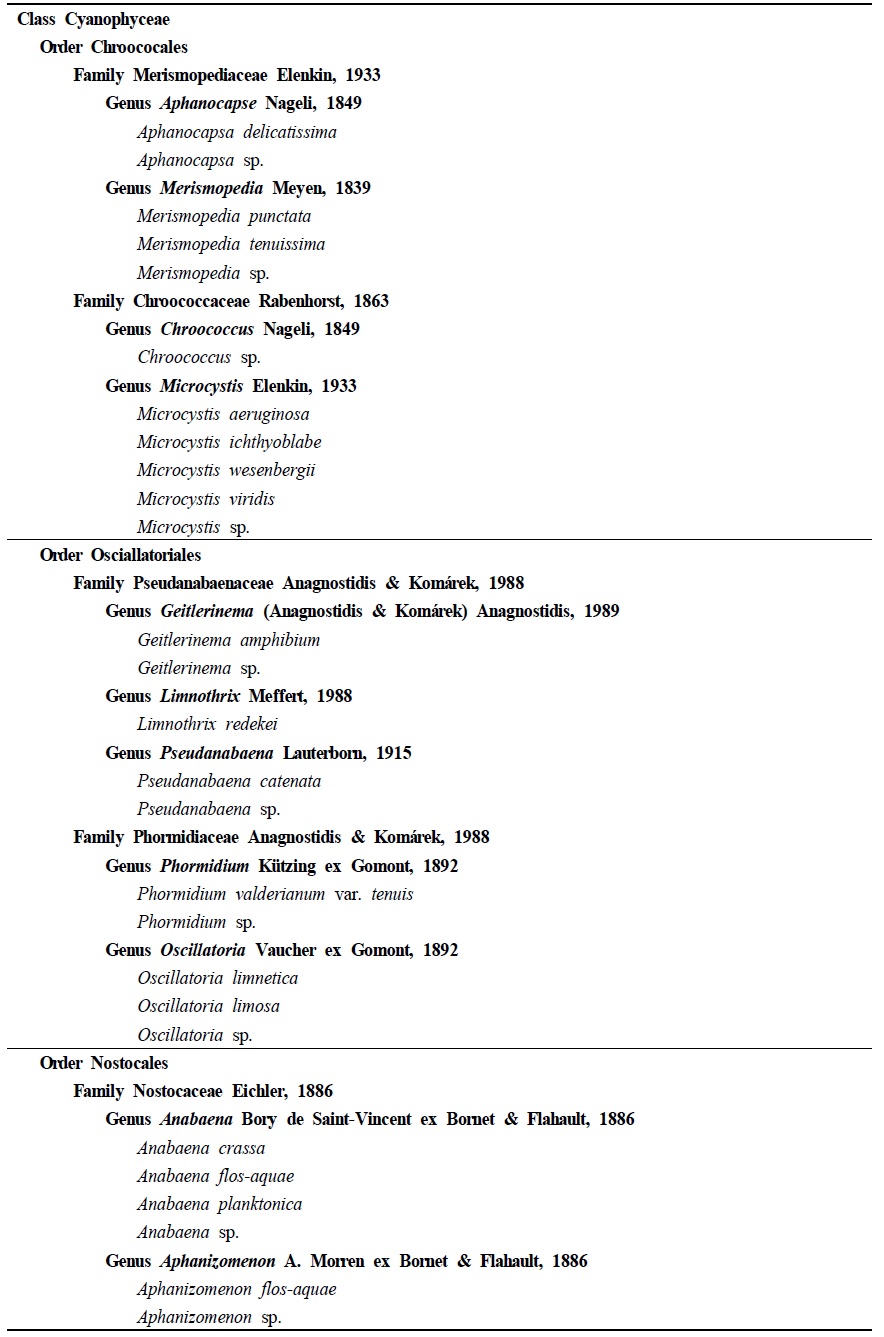 본 연구에서 출현이 확인된 분류군 중 남조류는 총 3목 5과 11속 26종 1변종으로 분류되었으며(Table 1), 총 조사기간 동안 출현 개체밀도는 24~42,001 cells/ml (기하평균 22 cells/ml)의 범위로 확인되었다. 분류군별 개체밀도는