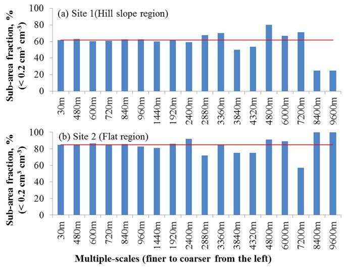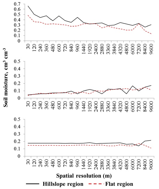 ํ ์์๋ถ์ด ๋๊ฒ ๋ํ๋ฌ์ผ๋ฉฐ, ์ฒญ๋ฏธ์ฒ ์ง์ 2์์๋ ์ ์ฒด์ ์ผ๋ก ๊ฑด์กฐํ ์๋ถํน์ฑ์ ๋ณด์๋ค. Fig. 3์ Fig. 2์ LANDSAT (30 m ร 30 m) ์๋ฃ์ ํด์๋๋ฅผ Resampleํ์ฌ 30~9,600 m ํด์๋๋ก ๋ณํํ์ ๋์ ํ ์์๋ถ์ด 0.2 cm3 cm-3 ์ดํ์ธ ๊ฒฉ์๋ค์ ๋น์จ ๋ณํ๋ฅผ ๋ํ๋ธ๋ค. ์ฌ๊ธฐ์ ๊ฐ ๊ฒฉ์์ ํ ์์๋ถ๊ฐ์ด 0.2 cm3 cm-3 ์ดํ์ด๋ฉด ๊ฐ๋ญ์ ์ํฅ์ ๋ฐ๋ ๊ฒ์ผ๋ก ๊ฐ์ ํ์๋ค(Shin and Jung, 2014). ์ฒญ๋ฏธ์ฒ ์ง์ 1๊ณผ ์ง์ 2์์ ์ฝ 3 km ํด์๋๋ก ๋ฎ์ถ ๋๊น์ง๋ ๋ฉด์ ๋น์จ(~ < 0.2 cm3 cm-3)์ด ํฌ๊ฒ ๋ณํํ์ง ์์์ผ๋, 3~4 km ์ดํ๋ถํฐ๋ ๊ณผ๋ ๋ฐ ๊ณผ์ํ๊ฐ๋๋ ๊ฒฝํฅ์ ๋ณด์๋ค. Fig. 4๋ ํด์๋์ ๋ณํ์ ๋ฐ๋ฅธ ํ ์์๋ถ ์ด๋ฏธ์ง ์๋ฃ์ ์ต๋, ์ต์ ๋ฐ ์ค์๊ฐ์ ๋ณํ๋ฅผ ๋ณด์ฌ์ค๋ค. ๊ณ ํด์๋(30 km ร 30 km)์์ ์ต๋๊ฐ๊ณผ ์ต์๊ฐ์