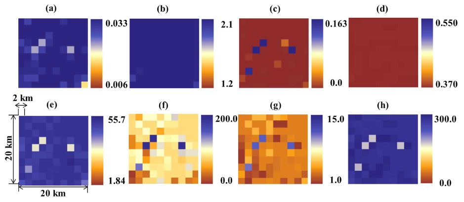 ์งํ(์ฒญ๋ฏธ์ฒ ์ง์ 1, Fig. 2(a))๊ณผ ํ์ผ์ง์ญ(์ฒญ๋ฏธ์ฒ ์ง์ 2, Fig. 2(b))์ ๊ณต๊ฐ์ ์ผ๋ก ๋ถํฌ๋์ด ์๋ ํ ์์๋ถ ๋ถํฌ๋ฅผ ๋ํ๋ธ๋ค. ์ฒญ๋ฏธ์ฒ ์ง์ 1์์๋ ์ ์ฒด ์ ์ญ์ ์ข์ธก ์๋จ, ์ค๊ฐ ๋ฐ ํ๋จ ๋ถ๋ถ์์ ์งํํน์ฑ์ ๋ฐ๋ผ