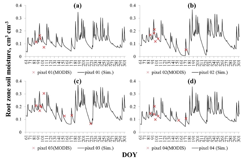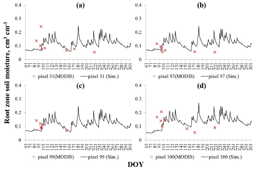 Drought, MODIS, Remotely sensed data, Root zone soil moisture, Soil and root parameters
