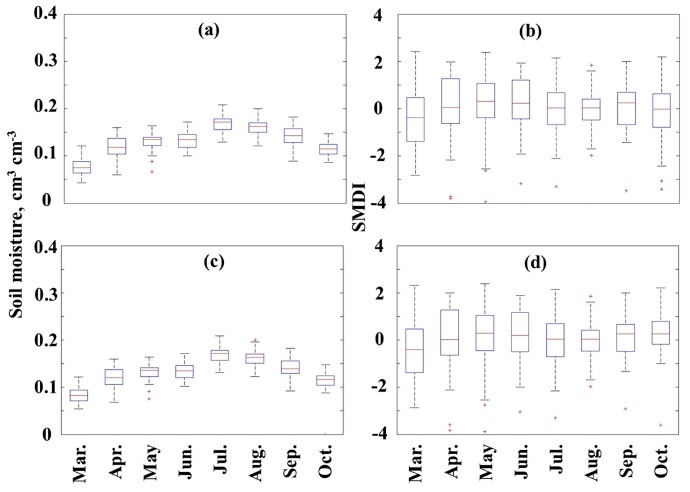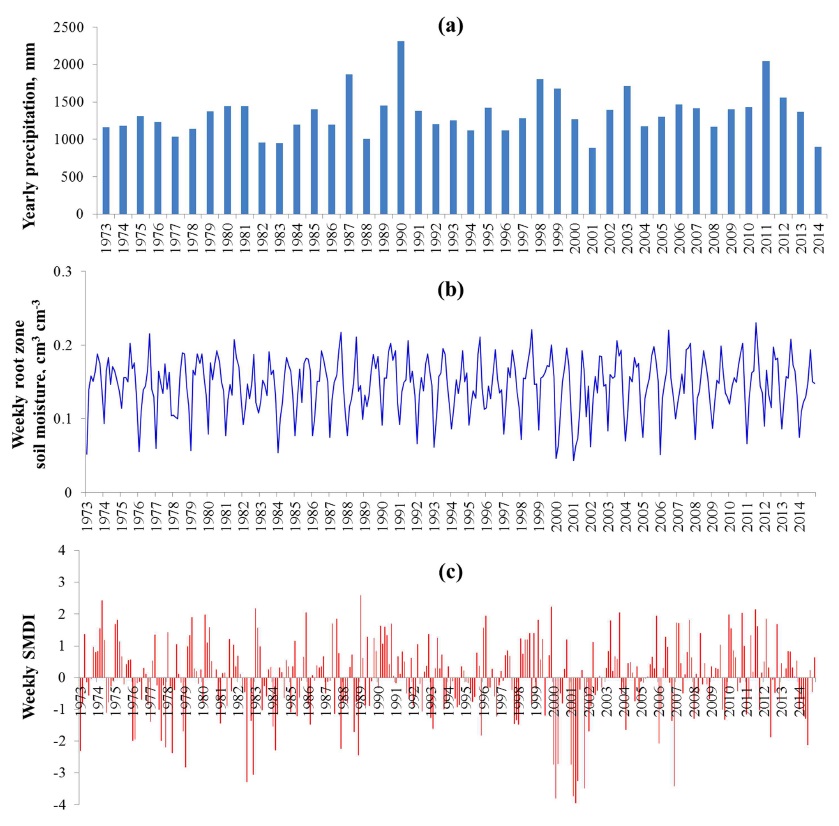 Statistics of the monthly root zone soil moisture and SMDI values from 1973 to 2014;