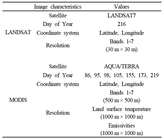 ์งํํน์ฑ์ ๋ํ๋ผ ์ ์๋ ํด์๋๋ฅผ ๊ฒฐ์ ํ๊ธฐ ์ํ์ฌ 30 m ร 30 m ๊ณ ํด์๋์ LANDSAT ์ด๋ฏธ์ง ์๋ฃ๋ฅผ ์ด์ฉํ์ฌ ํ ์์๋ถ์ ์ฐ์ ํ์๋ค. Table 1์ LANDSAT ๋ฐ MODIS ์๋ฃ์ ์ ์์ ๋ํ๋ธ๋ค.