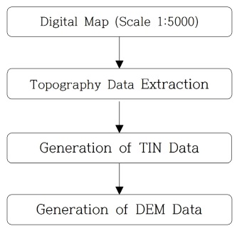 Park et al. (2007)은 DEM의 생성을 위한 과정을 Fig. 1과 같이 제시하였다. 본 연구에서는 국토지리정보원(National Geographic Information Institute, NGII)에서 제공하는