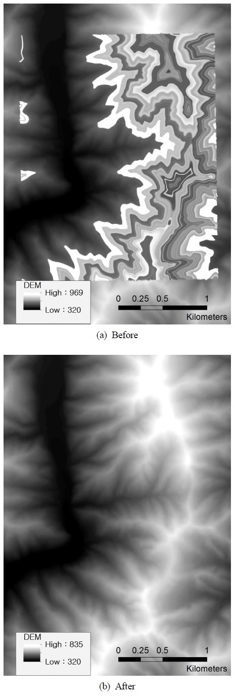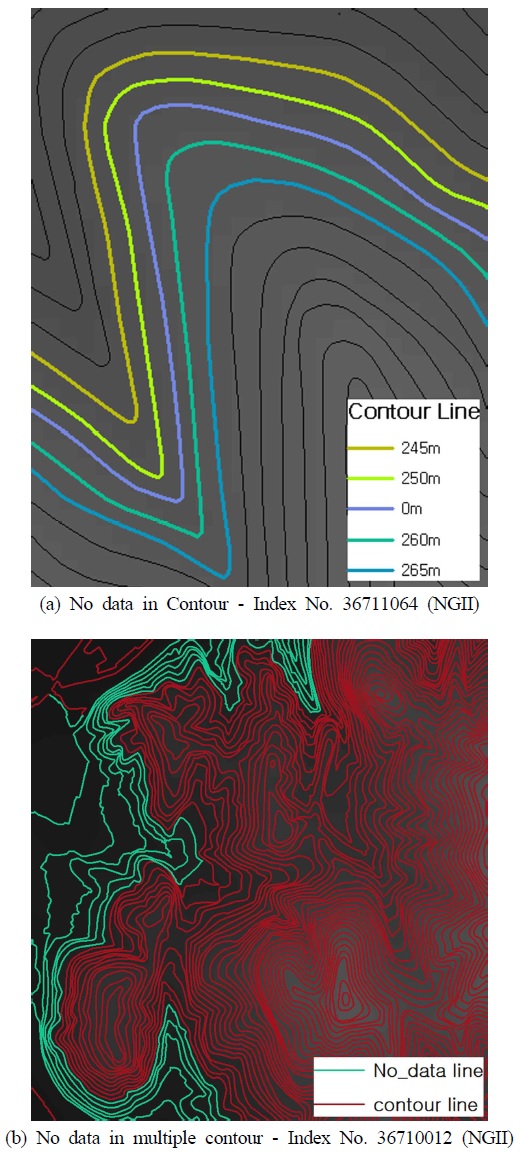 등고선의 수치가 불연속적인 값들의 경우, DEM 자료를 생성한 후에 오류가 발생한 도엽을 육안으로 식별하여 해당 도엽번호의 등고선 자료를 수정하였다.