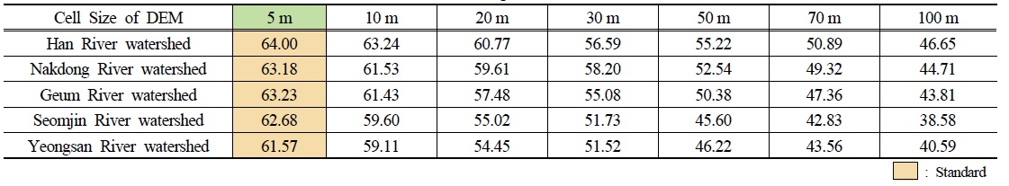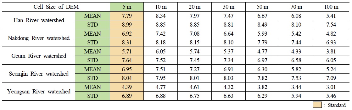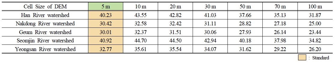 인자 값 산정 시 DEM의 해상도에 따른 불확실성이 발생한다. 그러나 대부분의 사용자들은 일반적으로 관련기관에서 제공하는 자료를 사용하거나 연구대상