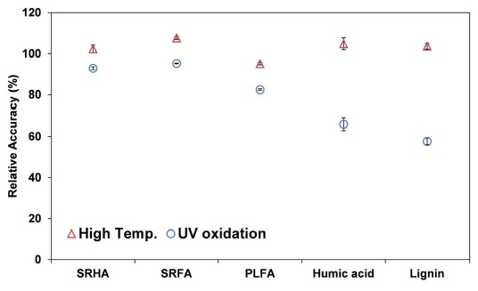 경우 일부 시료에서는 전혀 산화되지 않거나 과도한 농도값을 보였다. 한편 Benner and Hedges (1993)의 연구결과에 따르면 담수 시료의 경우 고온산화 방식과 UV산화방식에서 측정한 TOC 농도 간의 유의한 차이는 관찰되지 않았다. Byun et al. (2009)은 다양한 유기물을 함유한 시료에 대해 고온산화 방식과 UV산화방식에서 TOC 농도 간의 유의한 차이를 보였으며 이는 UV산화방식에서 크게 50%