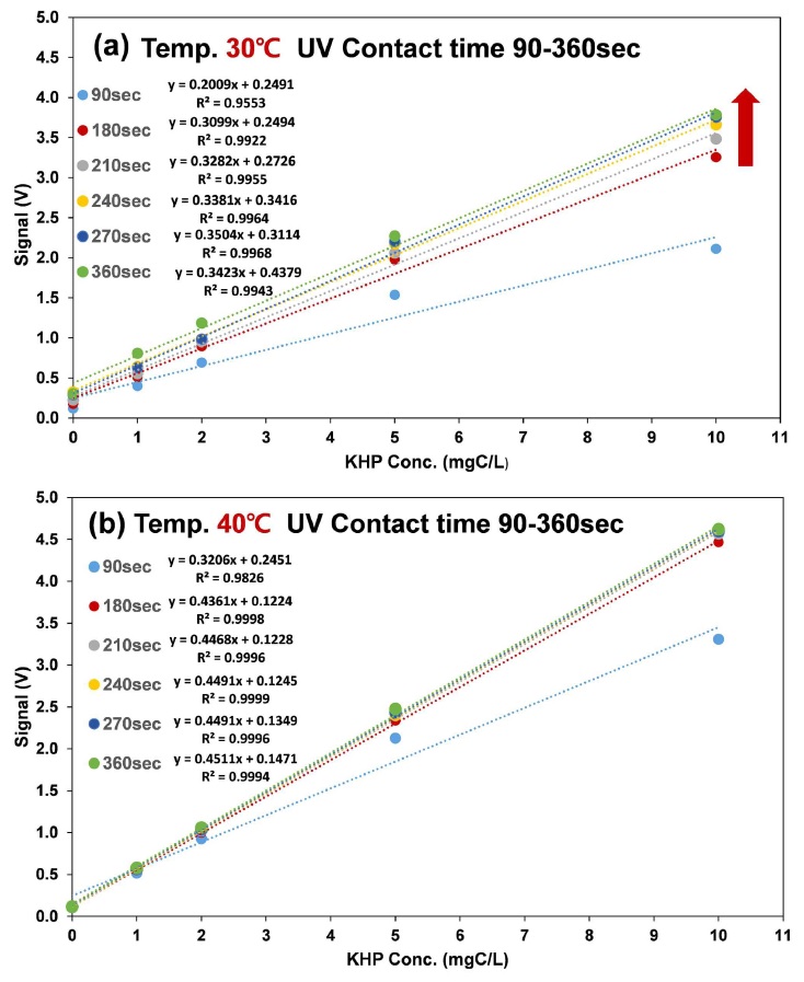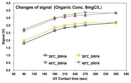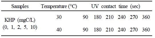 유기물 산화 시 UV reactor의 반응온도와 유기물 분해 시라디칼 형성을 위해 사용되는 UV 접촉시간을 산화 영향인자로 설정하였으며 이에 대한