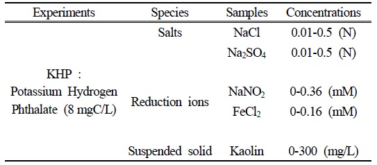 유기물 산화율에 영향을 주는 환경조건으로서 염, 환원성 이온, 부유물질을 고려하였다. 염(NaCl, Na2SO4)농도는 하천 등의 일반적인 수 환경 내에서의 이온강도(Park et al., 2009) 및 해수 조건을 고려하여 0.01-0.5 N으로 설정하였다(Takagi and Yoshida, 2006). 환원성이온의 경우 자연에서 존재할 수 있는 농도 범위를 고려하여 NO2-는 0-0.36 mM, Fe2+은 0-0.16 mM으로 설정하였고(Capriati et al., 2013; Verplanck et al., 2005), 부유물질(Kaolin, Sigma-Aldrich)의 경우 환경부 수질측정 자료를 참고하여 장마철 강우로 인한 최대 SS의 농도를 고려하여 0-300