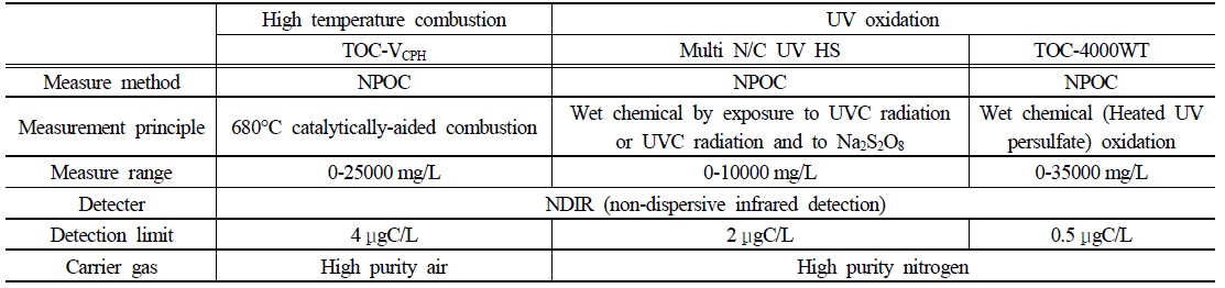 실험에 사용한 TOC 장비는 고온연소산화의 경우 Shimadzu사의 TOC-VCPH를 사용하였으며 UV산화법은 Analytikjena사의 Multi N/C UV HS와 H사의 TOC-4000WT를 사용하여 측정하였다(Table 2).