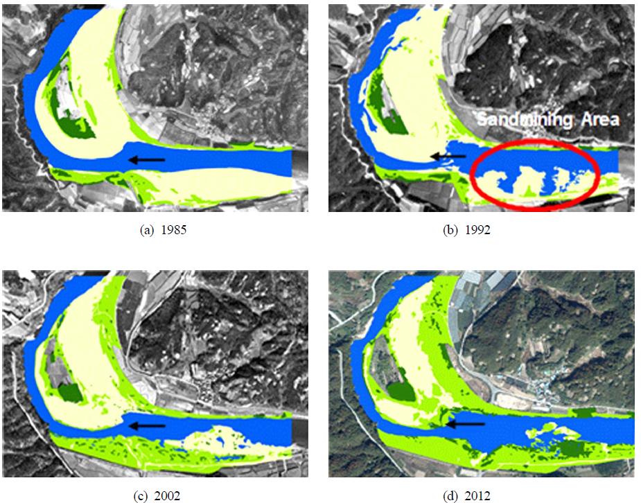 Change of sandbar in Gugang-ri 1985-2012. Black arrows indicate river flow. Red oval
