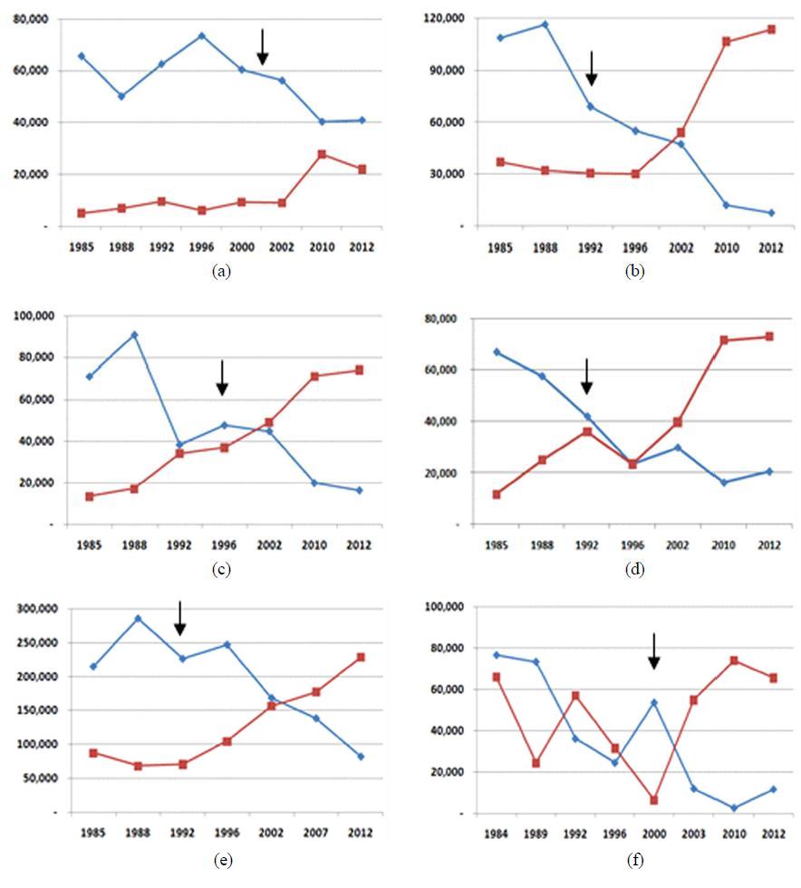 Area Change of sandbar and vegetation bar (m2, a: Reference, b: Hotanri, c: Sudu, d: Bonggok, e: Gugang, f: Yegok). Blue lines