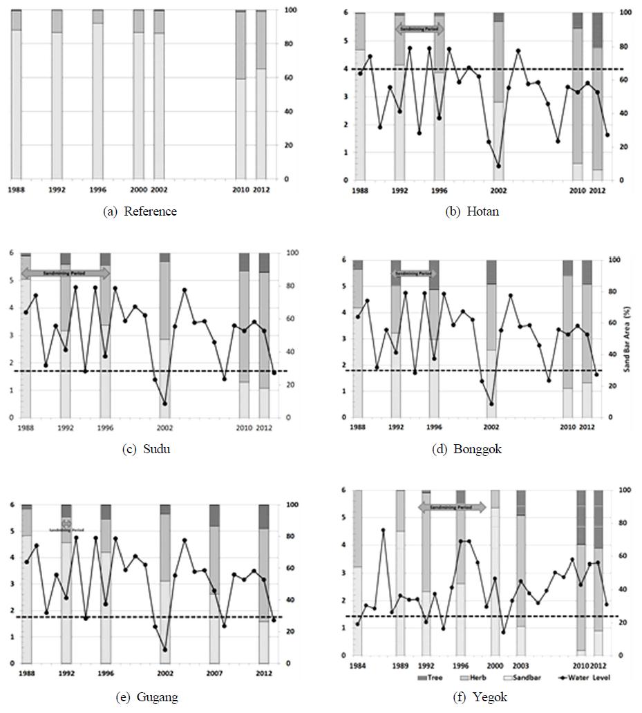 골재채취 이전 금강상류에서의 ‘맨’사주 면적은 봉곡리의 경우 1985년 전체사주 면적 중 85% (66,993/78,809 m2)를 차지하였는데 골재채취 시기에 54% (42,084/78,248 m2)로 줄어들었으며 이후에도 점진적으로 감소하여 2012년에 전체 사주면적의 22.1% (20,708/93,714 m2)를 차지하였다. 가장 감소율이 높은 호탄리의 경우는 2012년에 전체 사주면적의 6.4%로 (7,701/121,191 m2) 반면 목본과 초본의 식생 사주 면적은 골재채취 이후 전체사주의 93% (호탄, 113,490/121,191 m2)까지 급격히 증가하였으며 이는 초본사주(88,735/121,191 m2)에서 더 두드러지게 나타나 골재채취가 식생이 입을 촉진시킨 것으로 판단된다. 사주 내 식생이입은 댐에 의한 영향이 매우 큰 것으로 알려져 있으며,