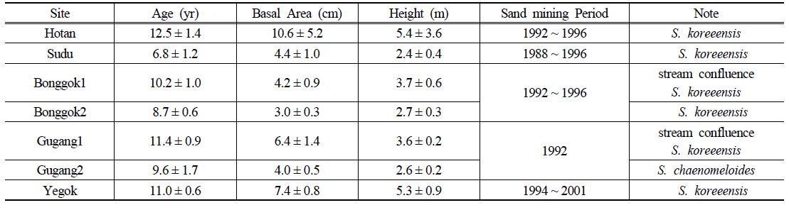 조사된 사주의 교목성 버드나무 수령은 6.8~12.5년 사이로 일반적인 관목성 버드나무류 천이 이후의 경향을 보인다. 항공사진 분석결과 골재채취 후