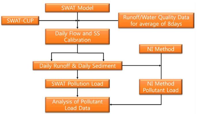 본 연구에서는 SWAT모형을 활용하여 총량 8일 간격 유량/수질자료를 1일 간격으로 확장하고, 1일 간격 유량/수질 자료를 통해 산정된 SS 오염부하량과