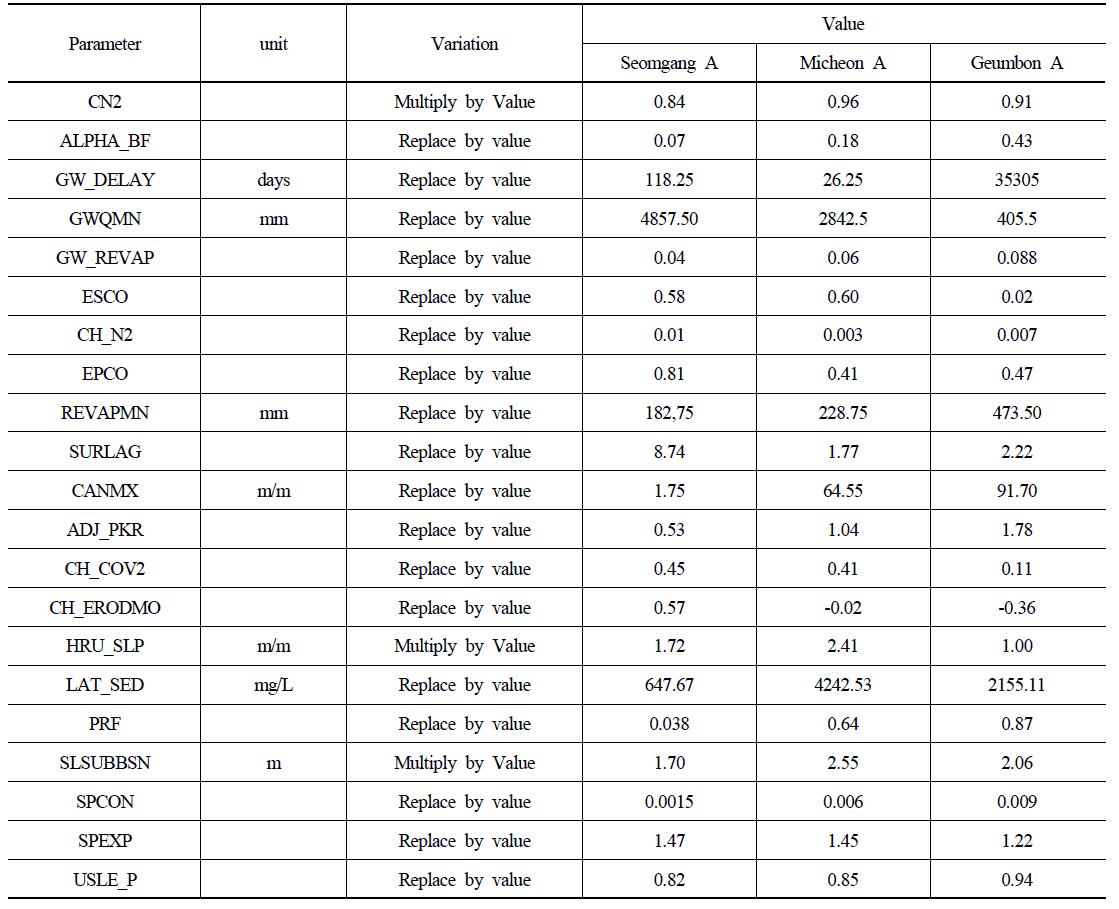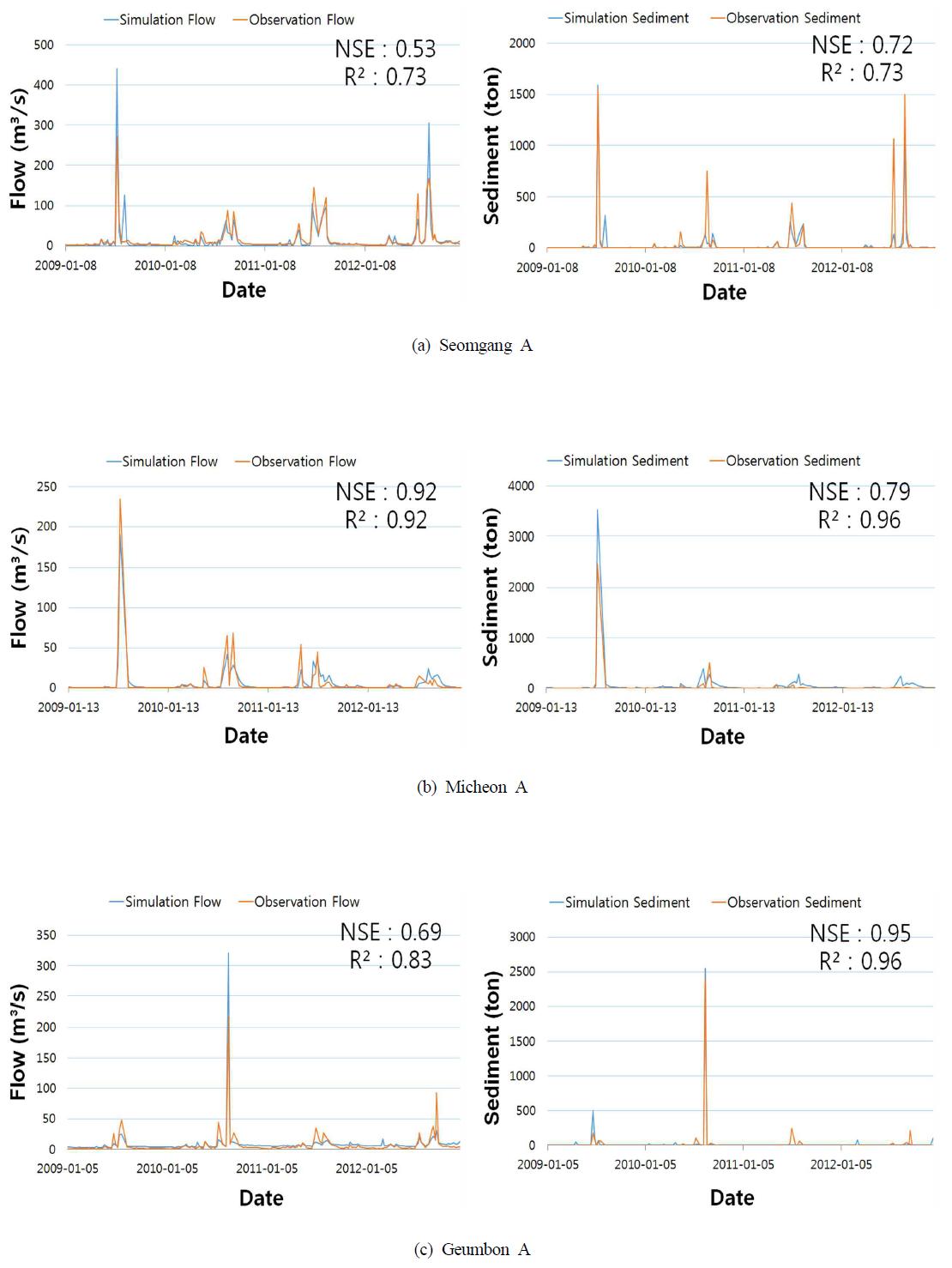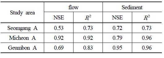 본 연구에서는 유출량과 유사량에 대한 보정을 수행하였다. 보정에는 물환경정보시스템에서 제공하는 2009년부터 2012년까지의 총량 8일 유량/수질자료를