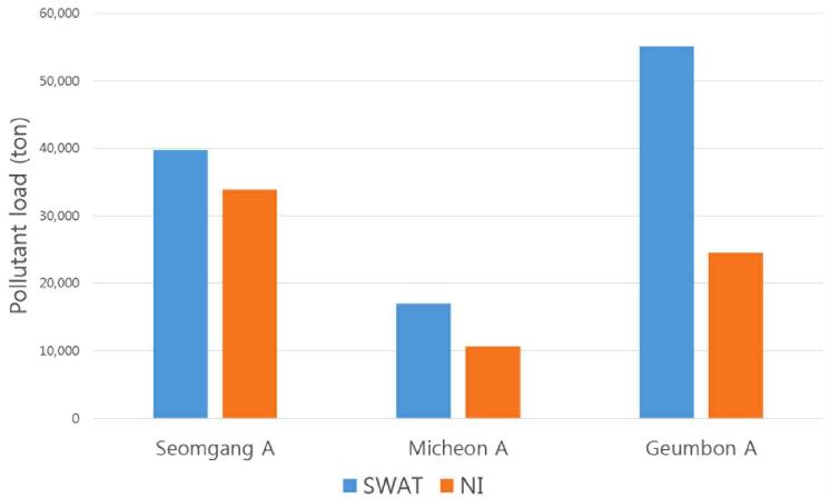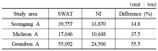 30,586ton 더 높게 나타났다. 이와 같이 NI방법으로 산정된 SS 오염부하량이 SWAT 모형의 SS 오염부하량 보다 최대 55.5% 작게 산정되었다.